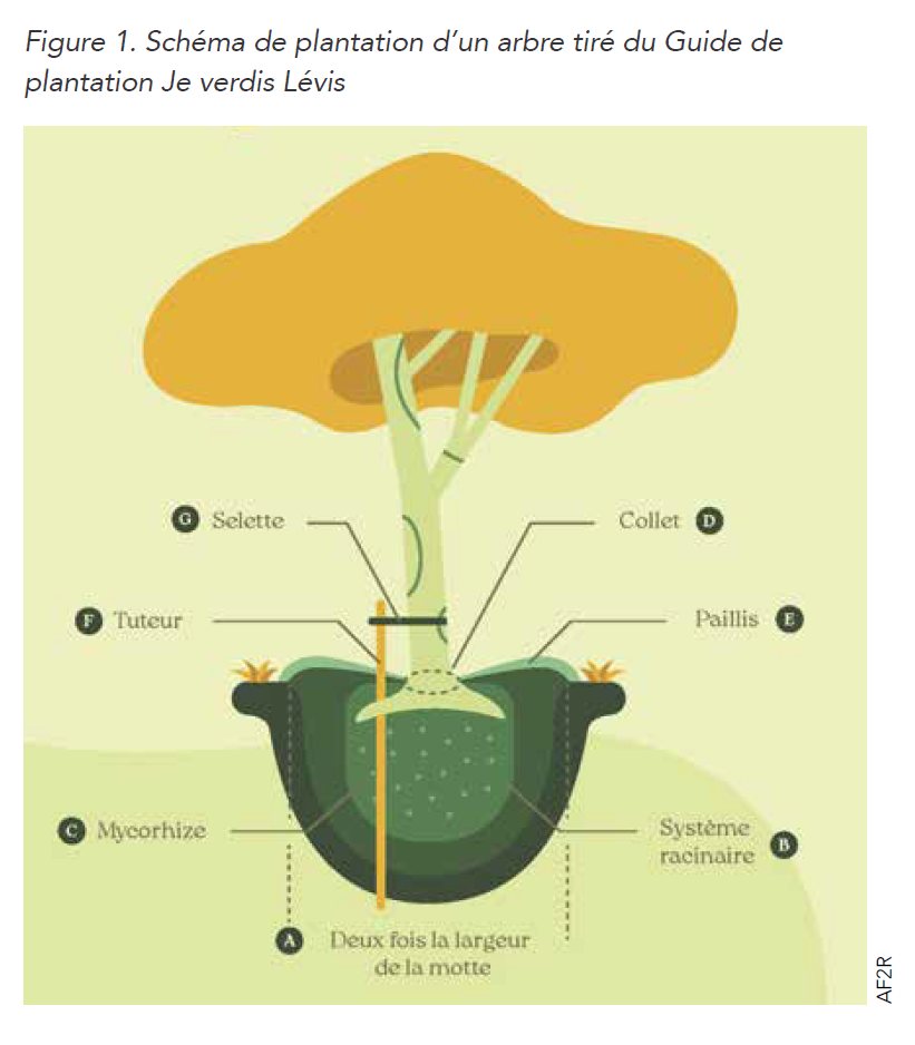 Ensuite, creusez un trou deux à trois fois plus large que la motte, mais de la même profondeur. Cela permet aux racines de s’étendre facilement dans un sol ameubli. Placez l’arbre dans le trou en veillant à ce que le collet (l’endroit où le tronc rencontre les racines – Figure 1) soit au niveau du sol ou légèrement au-dessus. Si l’arbre est en pot, détachez délicatement les racines enroulées pour favoriser leur expansion.