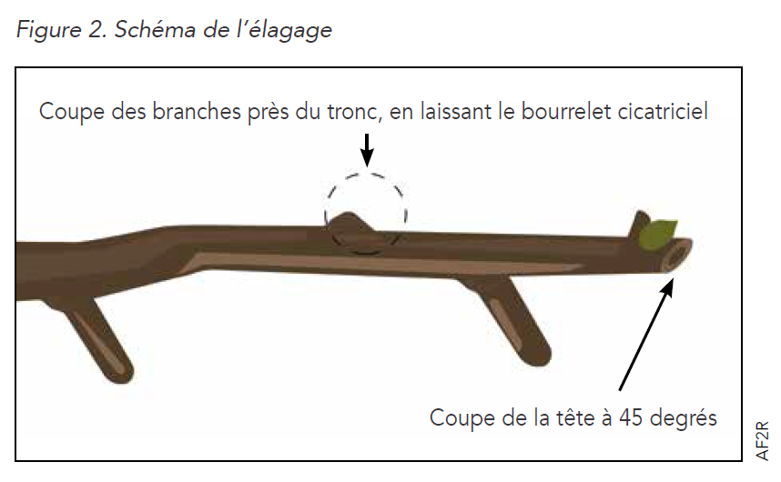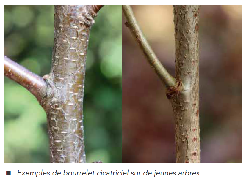 Attention : il ne faut jamais couper le bourrelet cicatriciel (aussi appelé collet de branche), cette zone renflée à la base de la branche. Elle contient les tissus nécessaires à la bonne cicatrisation de la plaie. Une coupe trop proche du tronc ou, au contraire, trop éloignée peut nuire à la guérison et exposer l’arbre à des infections.