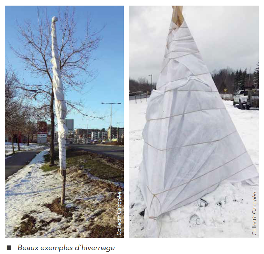Même en hiver, un peu de vigilance est de mise. Surveillez l’accumulation de neige sur les branches : trop de poids peut entraîner des bris. Vous pouvez attacher les branches ensemble pour limiter les tensions. Pour les jeunes arbres, entourez-les de jute, installez un pare-vent ou même une structure temporaire en bois si le site est exposé au vent et au soufflage de la neige.