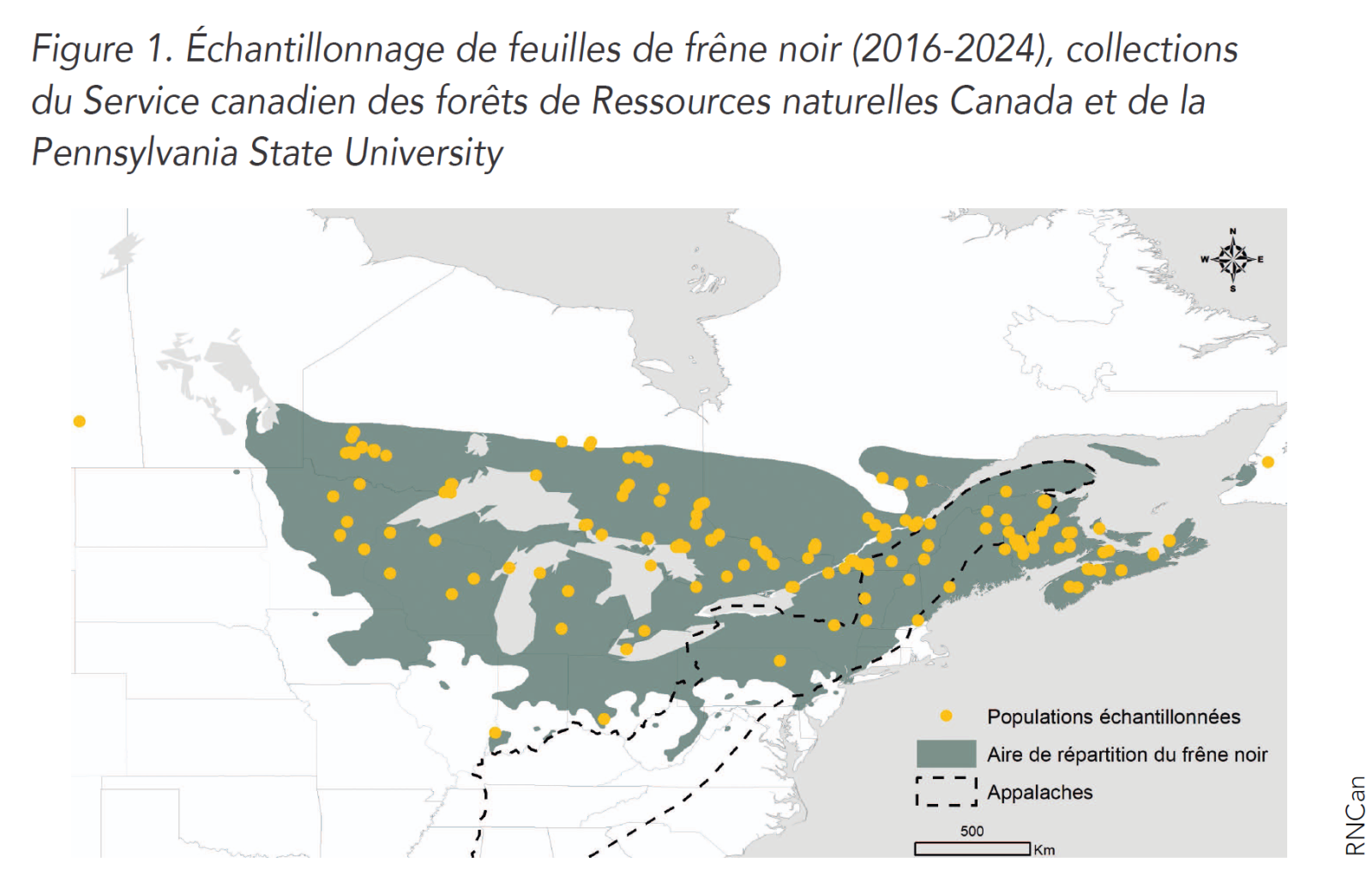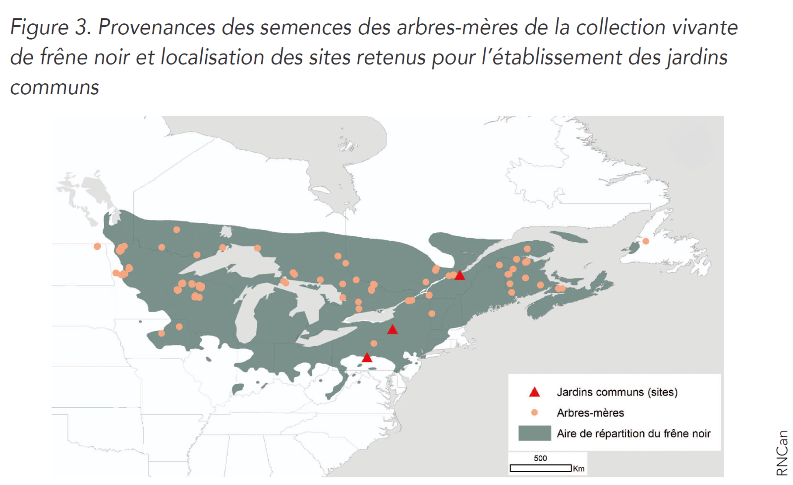 Le projet s’appuie sur des semences collectées au cours de la dernière décennie, grâce à la collaboration du CNSF, du USDA Forest Service et de la PSU. Ces semences proviennent de plus de 350 arbres-mères (familles), répartis sur une cinquantaine de provenances (localités) couvrant une grande partie de l’aire de répartition nord-américaine du frêne noir.