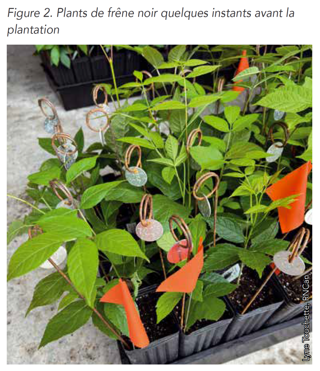 La première année du projet est surtout consacrée à la plantation, à la fertilisation et à l’entretien du site pour maximiser la survie des plants. Les jeunes frênes ont toutefois dû faire face à quelques défis : un choc de transplantation, un sol avec effet de battance, des attaques de rongeurs, des périodes plus sèches et des pluies diluviennes.