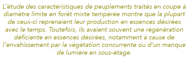 Jusqu’en 1990, la coupe à diamètre limite a été pratiquée en forêt mixte tempérée sur le territoire public québécois. À long terme, cette méthode de récolte, basée sur la récolte des arbres de plus gros diamètres, pourrait altérer la composition, la qualité et la régénération des peuplements. Qu’en est-il réellement après plusieurs décennies? L’étude des caractéristiques de peuplements traités avec cette méthode de récolte montre que la plupart ont repris naturellement leur croissance et leur développement au fil du temps, mais que la régénération y est très souvent déficiente.