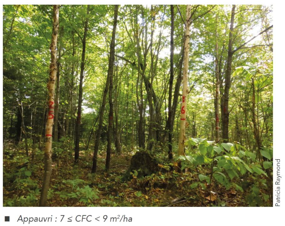 CFC des perches : capital forestier en croissance d’au moins 3,0 m²/ha en perches (DHP de 9,1 à 23,0 cm) d’essences désirées2.