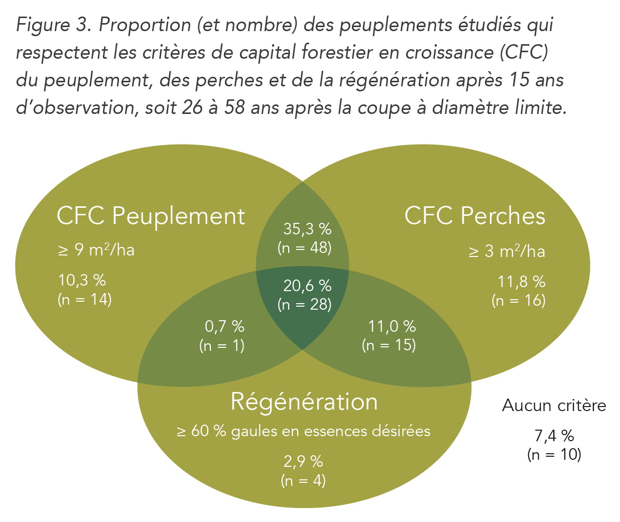 Après 15 ans de suivi, soit 26 à 58 ans après la coupe, les 136 peuplements ont été évalués selon trois critères diagnostiques :