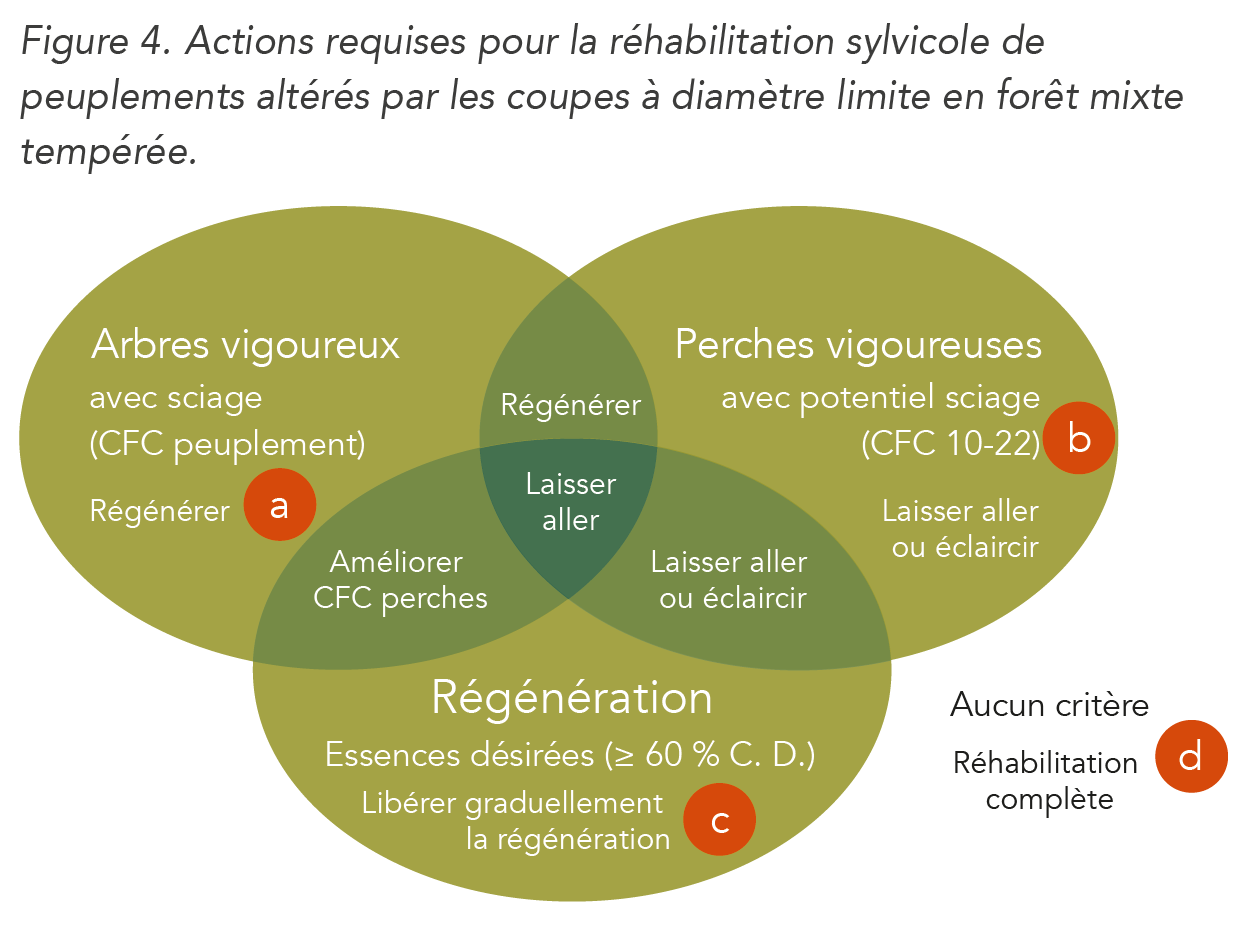 Ce modèle conceptuel permet de prioriser les actions sylvicoles à mettre en œuvre pour améliorer les peuplements altérés selon trois critères diagnostiques (Figure 4). Par exemple, lorsque le CFC du peuplement est suffisant et que la régénération est insuffisante (a), on priorisera des interventions visant à établir une nouvelle cohorte de régénération et, au besoin, des traitements de préparation de terrain et de plantation d’enrichissement.
