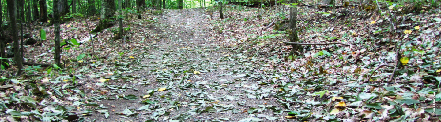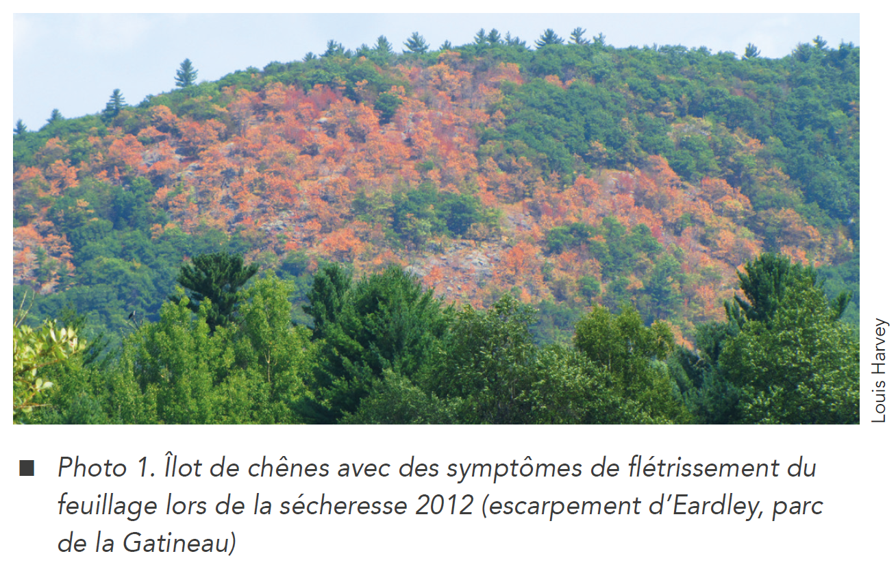 Cet été-là, plusieurs utilisateurs du parc ont remarqué des changements anormaux sur le feuillage des arbres. C’était les symptômes d’un stress hydrique marqué. Les premières espèces touchées, telles que le peuplier à grandes dents, le bouleau à papier et l’érable rouge, occupaient les sols minces. À la mi-juillet, les remarquables chênes montraient aussi des symptômes de flétrissement des feuilles du houppier, à un point tel que certains îlots forestiers occupant les affleurements rocheux avaient perdu partiellement leur feuillage. Le sol était jonché de feuilles vertes desséchées (photo d’en-tête). Et puis en août, l’érable à sucre, le hêtre à grandes feuilles, l’ostryer de Virginie et le frêne rouge sur sol mésique présentaient aussi des symptômes de flétrissement et de perte de feuillage.
