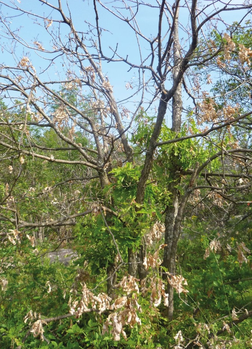 Chute des feuilles des arbres en juillet lors de la sécheresse 2012 (escarpement d’Eardley au parc de la Gatineau)
