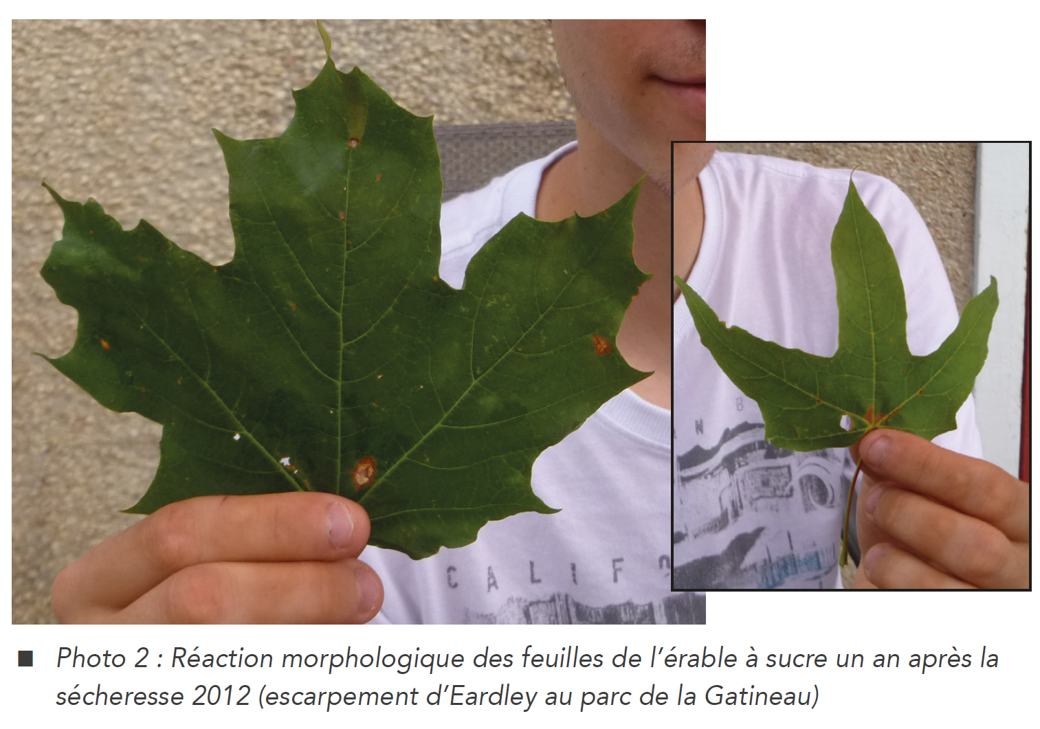 Cet épisode de sécheresse se caractérise par des températures de 1,8 °C au-dessus de la normale accompagnées d’une réduction de 50 % des précipitations entre mars et août 2012. À ces paramètres climatiques s’ajoute un printemps particulier dont les acériculteurs du sud du Québec se rappellent sûrement. Dans la ville de Gatineau, des records de température maximale ont d’ailleurs été atteints durant ce mois : soit 9,1 °C au-dessus de la moyenne, avec un record ponctuel de 27,4 °C entre le 17 et le 22 mars. Le faible couvert de neige a fondu très rapidement laissant le sol à nu hâtivement au mois d’avril.