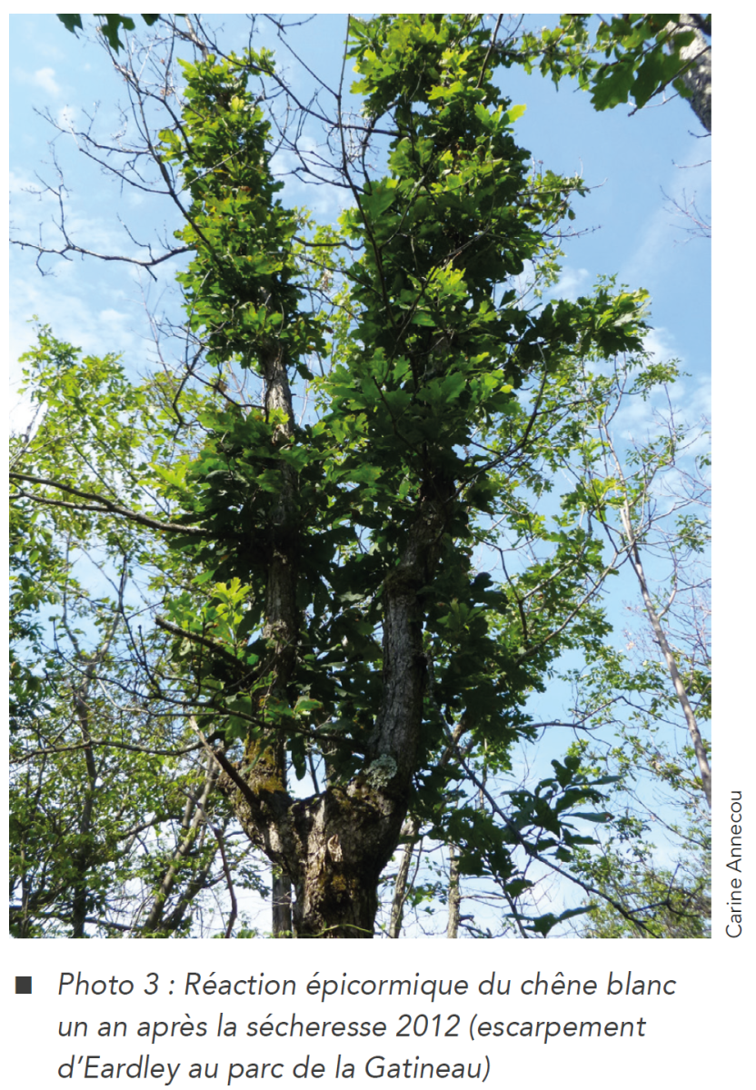 Les réactions morphologiques (photo 2) et physiologiques des arbres survivants, comme les pousses épicormiques (photo 3) et la surface foliaire spécifique (SLA). Ces résultats ne sont pas traités ici.