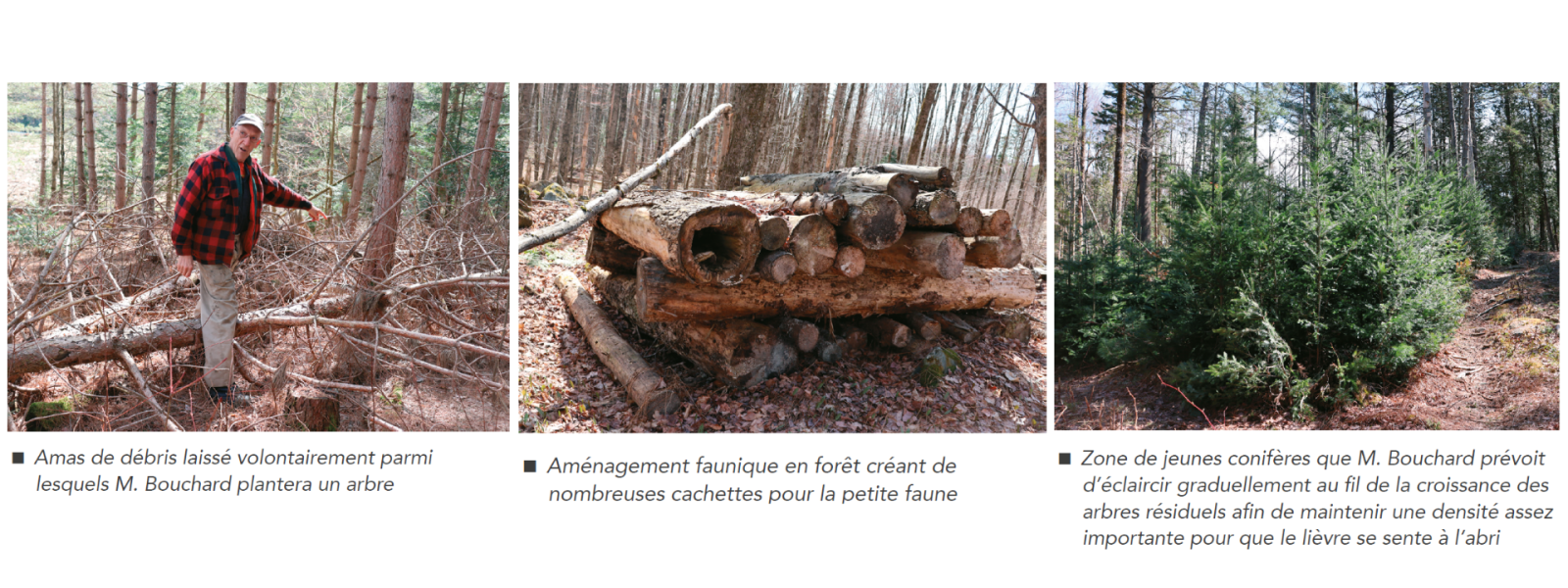 Grâce à cette connaissance de son territoire, il peut faire des choix avisés en termes de gestion. Parmi ses actions pour la faune, il crée de petits aménagements pouvant servir d’abri à la petite faune, généralement des amas de troncs et de branches. Il laisse des souches hautes pouvant servir au tambourinage de la gélinotte. Il s’assure de maintenir une densité d’arbres de sous-étage suffisante pour répondre au besoin du lièvre en termes d’obstruction latéral (protection visuelle d’une proie contre les prédateurs). Il préserve les chicots ainsi que des arbres ayant une cavité naturelle. Et ce sont que quelques-uns de ses projets...