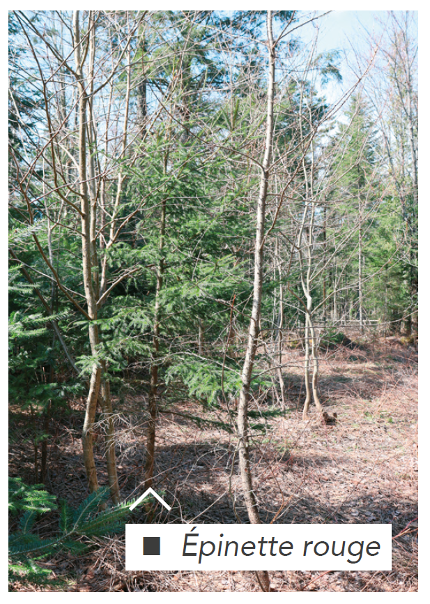 Les actions de M. Bouchard pour la biodiversité ne se limitent pas à la plantation d’arbres. Il identifie les espèces présentes dans son boisé et s’attarde aux plus rares. Par exemple, l’épinette rouge est une espèce qui se raréfie dans le sud du Québec. M. Bouchard a identifié ces épinettes et prévoit les dégager en retirant les arbres adjacents progressivement.