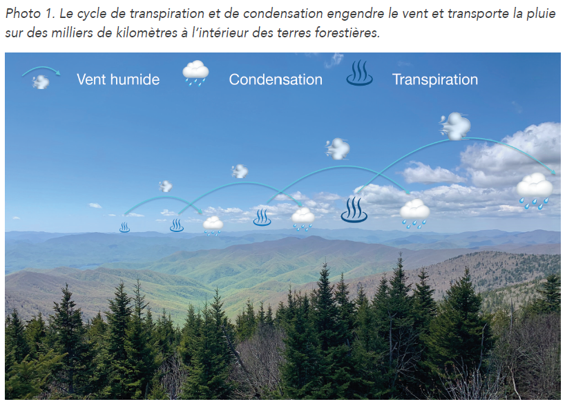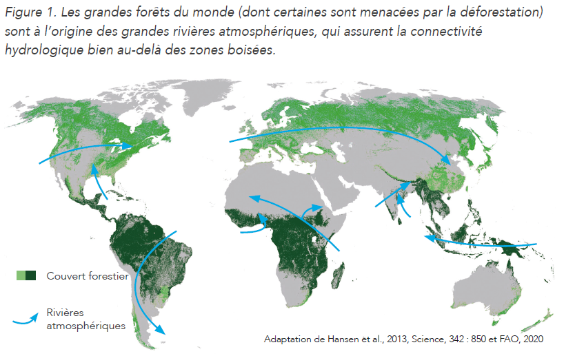 En Amazonie, l’eau de la forêt tropicale humide engendre au-dessus de la canopée d’immenses panaches de vapeur. Ces tempêtes de vapeur se déploient à l’image d’une véritable rivière atmosphérique pour nourrir la moitié du débit du grand fleuve et 70 % des pluies qui arrosent loin vers le sud, la Patagonie. Partout dans le monde, les massifs de forêts primitives constituent à la fois le moteur de la circulation de l’eau dans l’atmosphère et un frein à la sécheresse et à la désertification dans les zones périphériques (Figure 1).