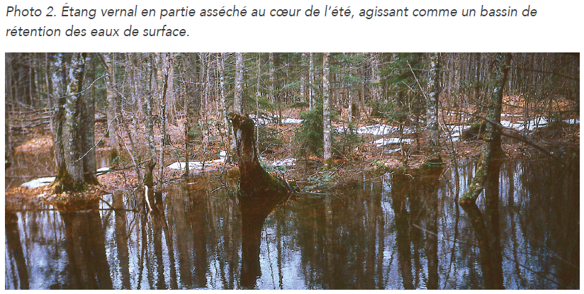 De manière plus significative, les forêts et les milieux humides préservent la structure et la perméabilité du sol, agissant comme une éponge, un filtre et un réservoir. Les sols forestiers, les terres humides et les plans d’eau emmagasinent les précipitations estivales et les eaux provenant de la fonte de la neige au printemps (Photo 2). Ces milieux atténuent les inondations, filtrent les sédiments et les polluants et régulent le débit des cours d’eau, réduisant ainsi le ruissellement de surface et l’érosion. La matière organique et le bois en décomposition retiennent les eaux de surface qui s’infiltrent à travers le sol poreux des forêts, favorisant la recharge des nappes souterraines avant l’arrivée des grands froids. Cependant, ce processus est lent et entravé par le gel du sol en hiver. À la suite d’un long épisode de sécheresse estivale, non seulement les cours d’eau atteignent leur plus bas niveau (image d’en-tête), mais les sources d’eau souterraine deviennent déficitaires, notamment dans les zones en grande partie déboisées.