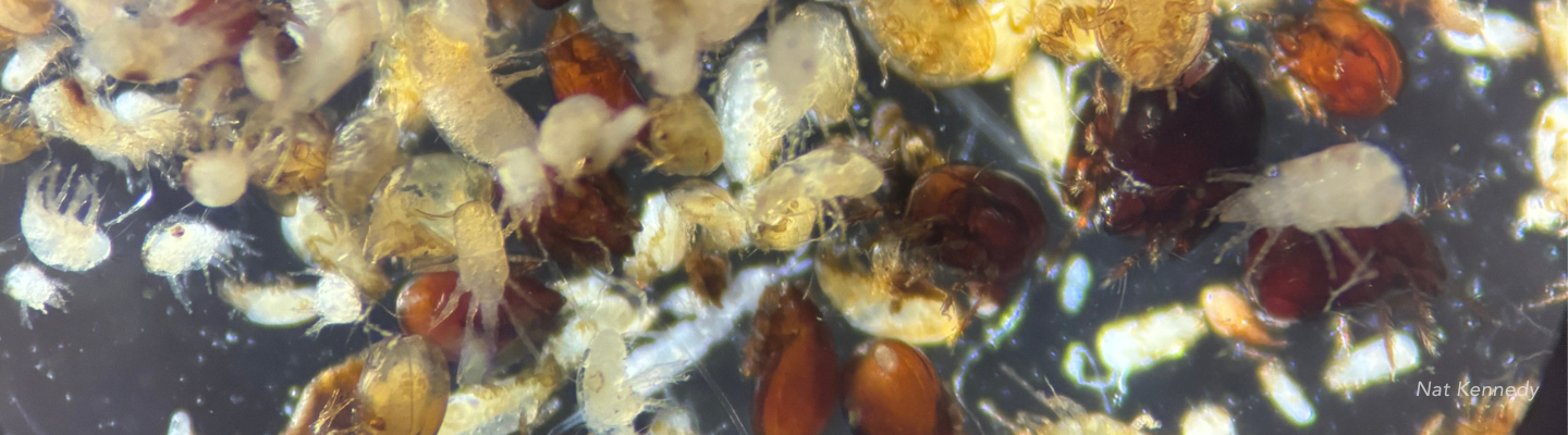 Un échantillon d’acariens prélevé dans du paillis de bois fragmenté raméal à l’été 2023 vu sous la loupe binoculaire