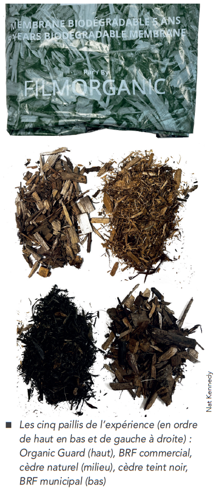 On a choisi trois paillis qui sont utilisés souvent dans l’aménagement des forêts urbaines : le bois raméal fragmenté (BRF), le paillis de cèdre naturel et le paillis de cèdre teinté noir. Ces paillis ont été achetés en pépinière.
