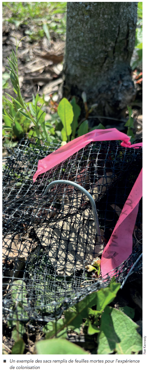 Cet automne, nous avons rempli des sacs de feuilles séchées et les avons placés à des distances de 0 m, 1 m, 2,5 m et 4,5 m des arbres ayant du paillis BRF ou des arbres témoins sans paillis. Les sacs ont été récoltés deux semaines plus tard afin d’être analysés. Nous sommes en train de dénombrer les invertébrés qui ont colonisé les sacs de feuilles pour voir si la proximité au paillis affecte la colonisation des invertébrés dans les feuilles mortes.