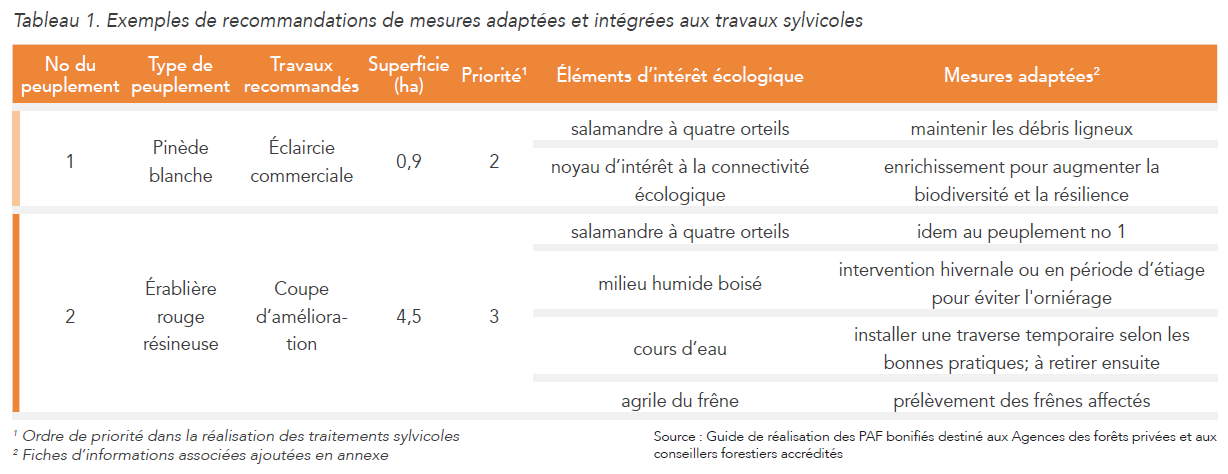 Le plan d’aménagement forestier (PAF) dresse le portrait des peuplements forestiers du boisé et suggère des traitements sylvicoles pour chacun d’eux pour une période de 10 ans. Le plan bonifié (PAFB) reprend les mêmes ren-seignements et intègre les informations des éléments d’intérêt écologique. Le plan bonifié recommande ainsi des mesures adaptées pour considérer ces derniers lors des activités forestières.