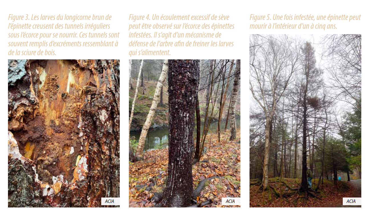 Le longicorne brun de l’épinette (Tetropium fuscum) est un petit coléoptère dont l’apparence rappelle celle de certaines espèces indigènes du Québec (Figure 1). Les adultes mesurent entre 10 et 15 mm (1/2 po) de long. Ils ont la tête et le thorax foncés et le ventre brun. Les larves matures sont blanchâtres et mesurent 25 mm (1 po) de long (Figure 2). Ces dernières causent des dommages aux épinettes (Picea sp.) en se nourrissant sous l’écorce, principalement dans la partie inférieure du tronc. En creusant des tunnels, elles entravent la circulation de la sève. Ces tunnels sont remplis d’excréments ressemblant à de la sciure de bois (Figure 3). Les arbres infestés produisent une quantité excessive de résine, qui s’écoule le long du tronc par de nombreuses plaies causées par l’activité des larves (Figure 4). À un stade avancé d’infestation, les aiguilles jaunissent et l’arbre dépérit (Figure 5).