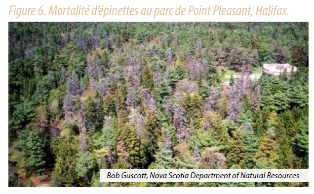 Sa découverte en Amérique du Nord remonte à 1999, au parc Point Pleasant près de Halifax, en Nouvelle-Écosse (Figure 6). Il est probablement arrivé au Canada dissimulé dans le bois de matériaux d’emballage non-traités importés de l’Europe. Des recherches menées en Nouvelle-Écosse révèlent qu’il préfère s’attaquer aux épinettes matures déjà affaiblies par d’autres facteurs, tels que les dommages causés par le vent ou le gel. Bien qu’il puisse aussi s’attaquer à des arbres en bonne santé, son développement y est généralement plus lent.