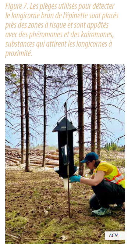 Depuis sa détection en Nouvelle-Écosse, l’Agence canadienne d’inspection des aliments (ACIA) a implanté un programme de surveillance du longicorne brun de l’épinette dans l’est du pays. Ce programme repose notamment sur l’utilisation de pièges appâtés avec des substances odorantes attirant les longicornes (Figure 7). Au milieu des années 2010, une population de l’insecte a été détectée au Nouveau-Brunswick. Toutefois, grâce aux mesures réglementaires et aux traitements sylvicoles mis en place, son établissement dans cette province semble avoir été évité.