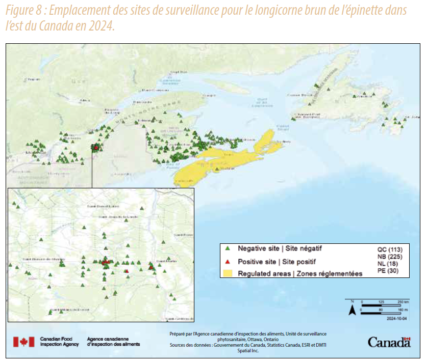 La surveillance du longicorne brun de l’épinette au Québec a commencé en 2009 et est menée par l’ACIA en collaboration avec le ministère des Ressources naturelles et des Forêts du Québec (Figure 8). La première interception dans la province date de 2023, quand deux adultes ont été capturés dans des pièges situés dans la MRC de Beauce-Sartigan. À l’été 2024, la surveillance a été intensifiée dans ce secteur et six adultes supplémentaires ont été piégés, signalant qu’une population de longicorne brun de l’épinette se serait implantée dans le secteur. Des inspections visuelles ont également été menées pour repérer un foyer d’infestation, mais jusqu’ici aucun spécimen n’a pu être récolté directement dans des épinettes au Québec. Cela suggère que la population en Beauce serait établie depuis peu et que l’insecte n’y serait pas encore abondant.