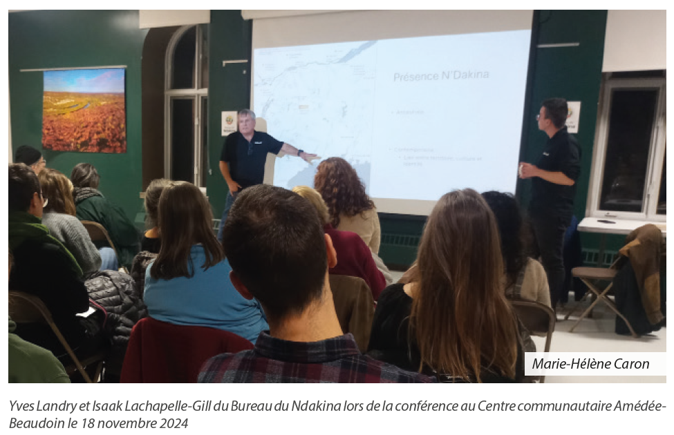 Yves Landry de W8linak et Isaak Lachapelle-Gill d’Odanak sont gardiens du Ndakina. Le 18 novembre dernier, sur invitation de l’Association pour le boisé Ascot-Lennox (ABAL), ils ont parlé aux citoyen(nes) de la relation des W8banakiak au territoire. Cette vaste étendue de forêts, à la frontière des colonies françaises et anglaises, a été déboisée aux XVIIIe et XIXe siècles pour être transformée en terres agricoles. La nouvelle occupation du territoire a eu pour conséquence de priver les W8banakiak des ressources nécessaires pour se loger, se nourrir et se soigner.