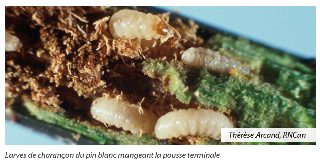 Le charançon du pin blanc s’attaque principalement aux flèches apicales des jeunes pins et épinettes qui se développent en pleine lumière. Les adultes pondent des œufs très tôt au printemps, avant le débourrement des arbres, et ce, directement sous le bourgeon apical, dans de petits trous qu’ils ont préalablement creusés pour s’alimenter. Les larves éclosent après une dizaine de jours et consomment l’intérieur de la flèche apicale de l’année précédente, ce qui provoque la mort de cette pousse et de celle en cours de croissance. Les conséquences sont :