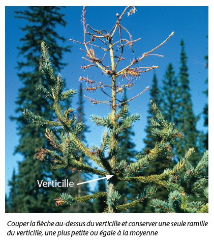 Ensuite, les aiguilles de la pousse annuelle et de celle de l’année précédente rougissent et tombent. Puis, ces pousses meurent et chutent à l’automne sous l’action du vent, des pluies fortes ou de la neige. Enfin, lors de l’année suivante, les branches du dernier verticille vivant se redressent pour tenter de reprendre la dominance apicale, créant une forme caractéristique en chandelier. Chez les épinettes, l’une de branches va généralement dominer les autres et se prolonger pour devenir un tronc unique générant une faible déformation à long terme comparativement aux pins.