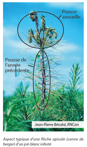 On reconnaît la présence du charançon du pin blanc à différents signes selon la période de l’année. Au printemps, de petits trous apparaissent sur la pousse terminale directement sous le bourgeon apical et de la résine peut s’écouler des trous. Entre la mi-juin et le début de juillet, la pousse annuelle se flétrit et prend une forme caractéristique, celle d’une canne de berger.