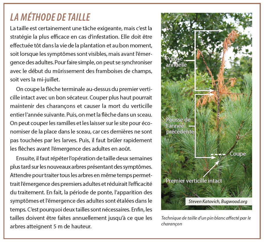 Si on laisse l’infestation progresser et atteindre un taux de 10 % d’arbres touchés, la taille devient alors contre-indiquée considérant les coûts du traitement (temps et/ou argent) et les risques de réenvahissement des charançons.