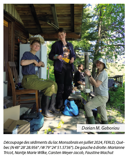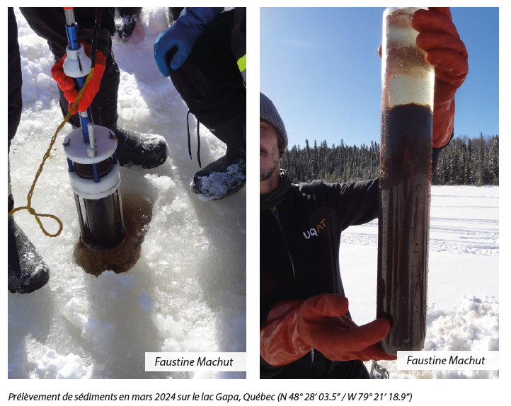 Des carottes de sédiments ont été extraites des lacs Clo, Monsabrais, Gapa, Francis et Hébécourt en mars et juillet 2024. Situés dans la FERLD, ils se distinguent par leur taille (2,32 à 775 hectares), leur profondeur (1,2 à 3,8 m) et leur connectivité avec leur bassin versant. Ces lacs offrent la possibilité d’étudier la composition des sédiments sur plusieurs siècles en réponse à des incendies successifs. Les données sédimentaires seront croisées avec les archives dendrochronologiques déjà existantes sur le milieu d’étude qui ont permis de dater précisément les périodes de feux des derniers siècles et de mettre en place un historique spatio-temporel des incendies. Le projet repose sur une approche regroupant trois disciplines, la paléoécologie, la paléolimnologie et la dendroécologie, qui étudie la croissance des arbres et les cernes de croissance pour reconstituer les événements environnementaux passés, comme les incendies. Il offrira une vision détaillée des cycles de perturbations naturelles et de leurs effets sur les eaux lacustres dans le temps et dans l’espace.
