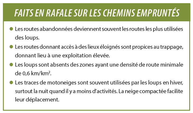 La chasse et le piégeage représentent un danger mortel pour lui. La fragmentation du paysage est un obstacle à ses déplacements et à sa recherche d’un endroit convenable où s’établir. Les routes représentent un frein majeur à la dispersion du loup. D’ailleurs, la plupart des mortalités de loups ont lieu dans un périmètre de 250 m autour des routes. De plus, les routes fracturent les territoires potentiels.