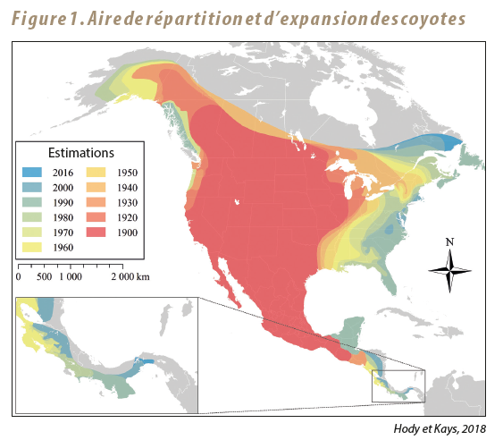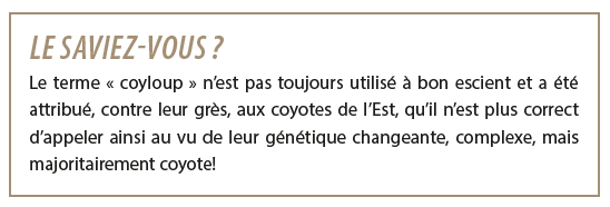 Génétiquement composés à 60 % de coyote, 30 % de loups et 10 % de chien en moyenne, ces individus sont appelés « coyotes de l’Est ». Ils se sont dispersés dans tout l’est du Canada, posant une première patte au Québec, en Outaouais, en 1944. Quelques décennies ont suffi pour que ces derniers se rendent jusqu’en Gaspésie, aux Îles-de-la-Madeleine et au Labrador en 1995. Aujourd’hui, ils occupent une grande variété d’habitats : forêts feuillues, forêts boréales et divers milieux modifiés par l’homme. Très présents sur la rive sud où l’absence de loups leur permet d’atteindre de fortes densités, ils sont moins nombreux sur la rive nord puis limités au nord de la forêt boréale en raison de la présence des loups gris.