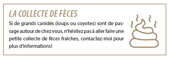 Le projet que je mène à l’Institut des Sciences de la Forêt Tempérée, Université du Québec en Outaouais (UQO), porte sur les conséquences de l’hybridation entre loups et coyotes sur leur régime alimentaire. Ce projet s’étend sur une grande partie de la rive nord et apportera, je l’espère, de nombreuses réflexions et clarifications quant aux rôles de chacun dans les écosystèmes forestiers québécois, notamment concernant la régulation des populations de proies.
