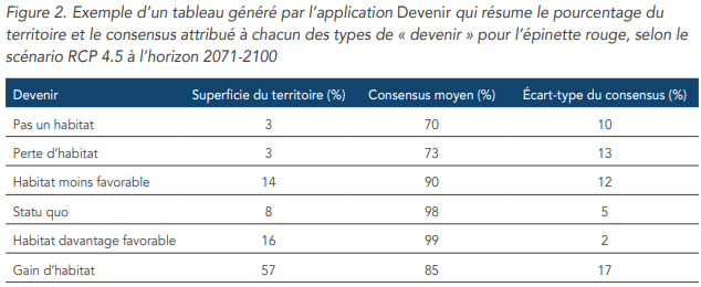 Parallèlement à la carte, Devenir génère un tableau qui résume, pour chaque type de « devenir », la part du territoire concerné ainsi que le niveau de consensus entre les différentes projections. Par exemple, pour l’épinette rouge dans un scénario climatique modéré (RCP 4.5), à l’horizon 2071-2100, on observe que 3 % du territoire des zones tempérée nordique et boréale correspondrait à une perte d’habitat. Le consensus moyen associé à cette prévision atteint 73 %, avec un écart-type de 13 %, ce qui indique une bonne convergence entre les modèles (Figure 2).