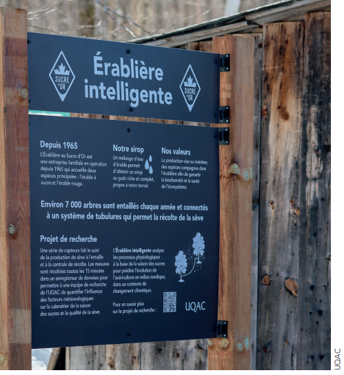 L’Érablière intelligente de l’Université du Québec à Chicoutimi analyse les processus physiologiques à la base de la saison des sucres pour prédire l’évolution de l’acériculture en milieu nordique, dans un contexte de changement climatique. Une étroite collaboration avec l’érablière Au Sucre d’Or à Laterrière.