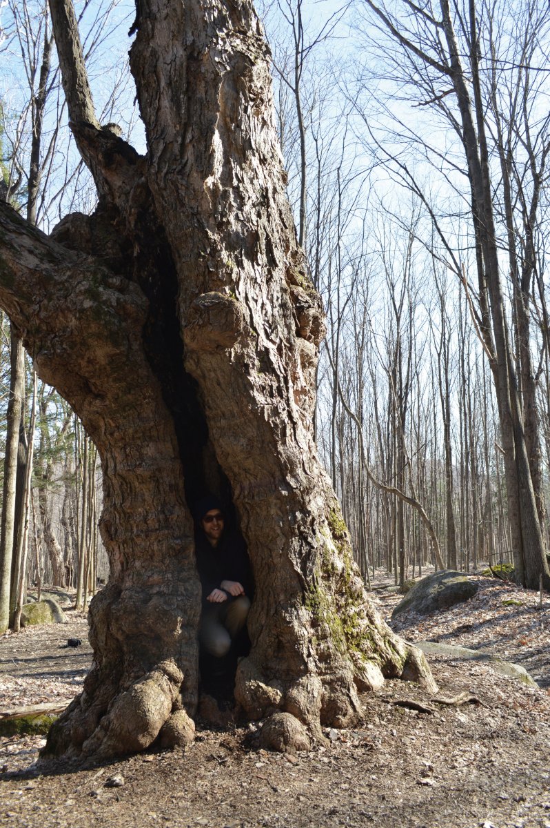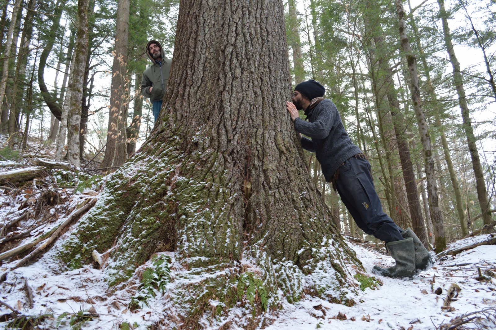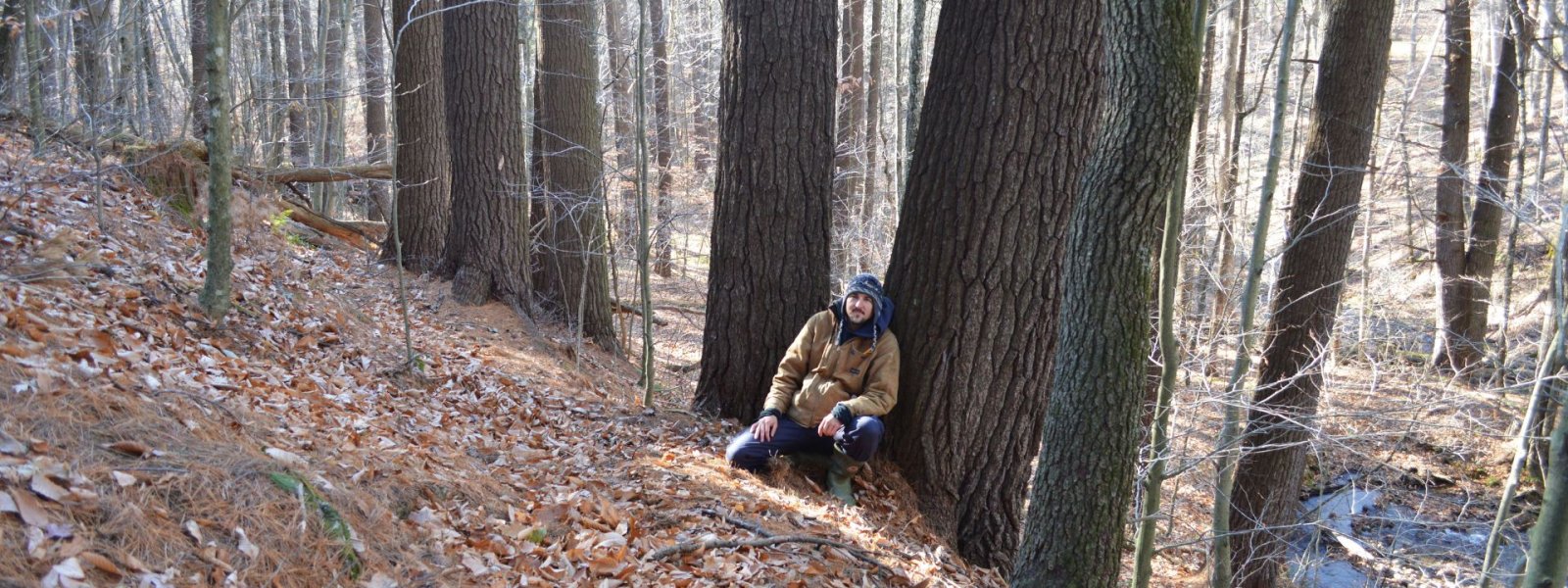Gabriel Grenier dans une forêt ancienne de Fisher Scott Memorial Pines Natural Area à Arlington au Vermont