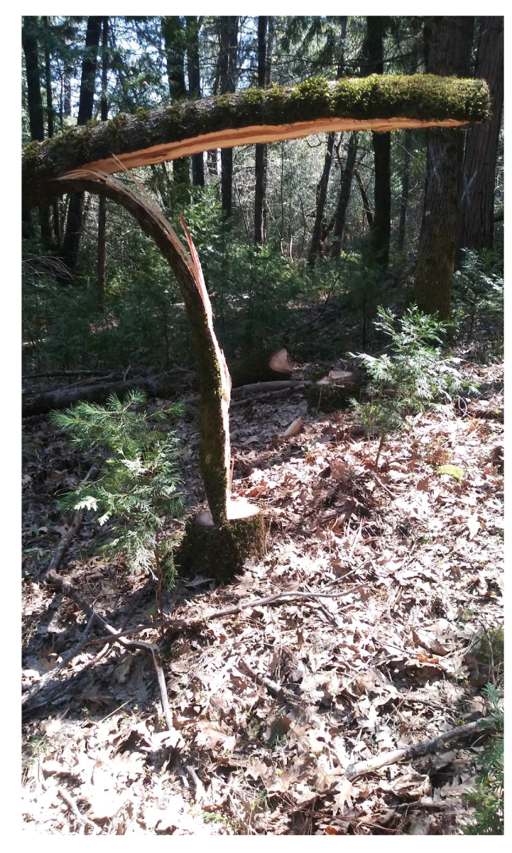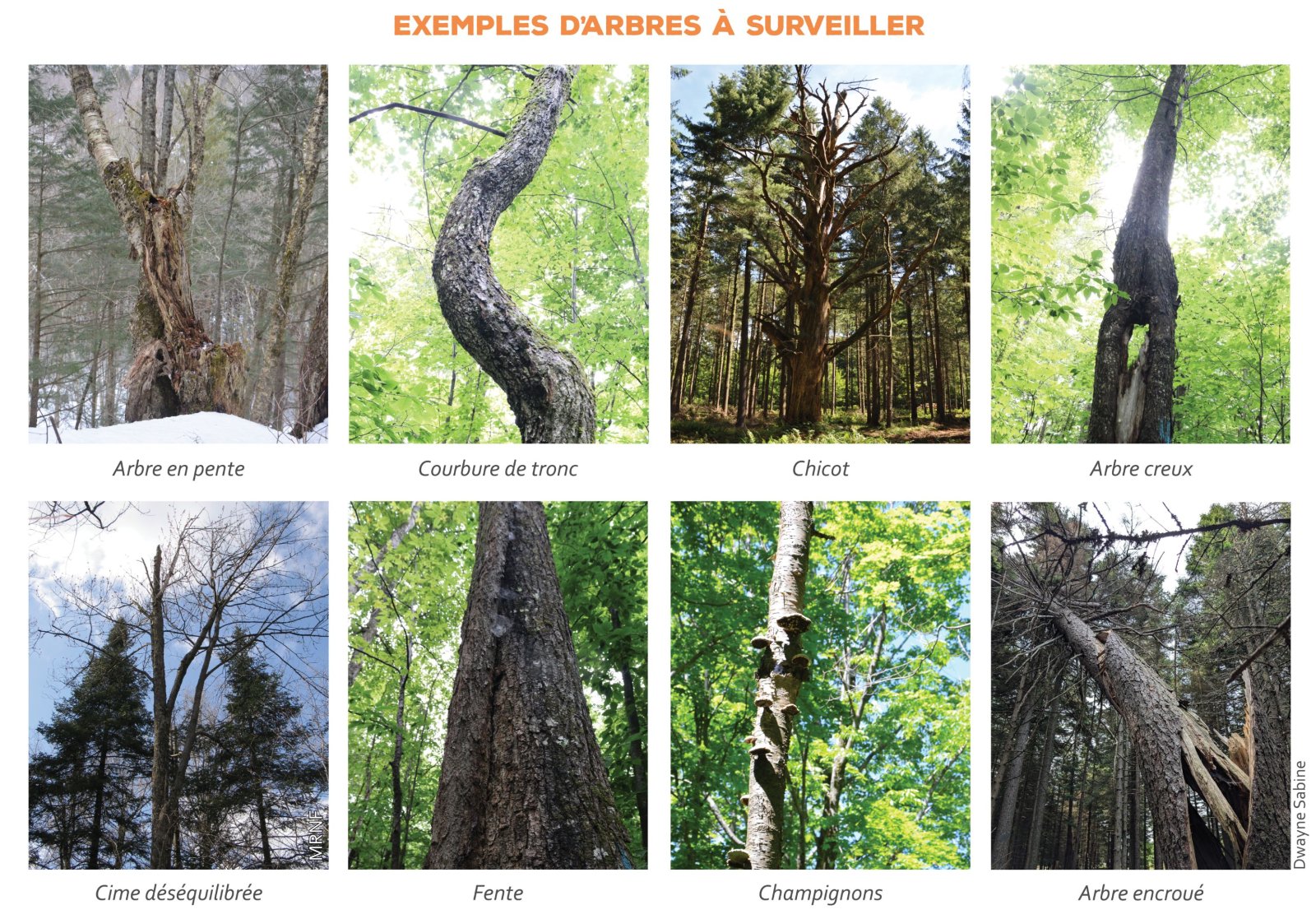 Arbres dangereux (ex. : chicot ou arbre encroué [soutenu par un ou plusieurs arbres voisins]);