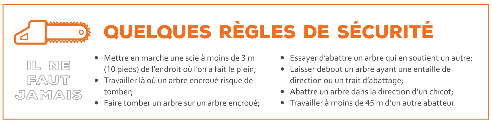 L’abattage d’arbres à l’aide d’une scie mécanique est une activité qui n’est pas sans risque, comme le démontre le nombre de décès et de blessures reliés au travail en forêt chaque année. Il est illusoire de penser qu’on peut éliminer tous les dangers d’une telle opération, mais il est possible, grâce à une bonne technique d’abattage, des équipements de protection individuelle adaptés et des connaissances sur le fonctionnement de la scie, de les réduire presque à zéro.