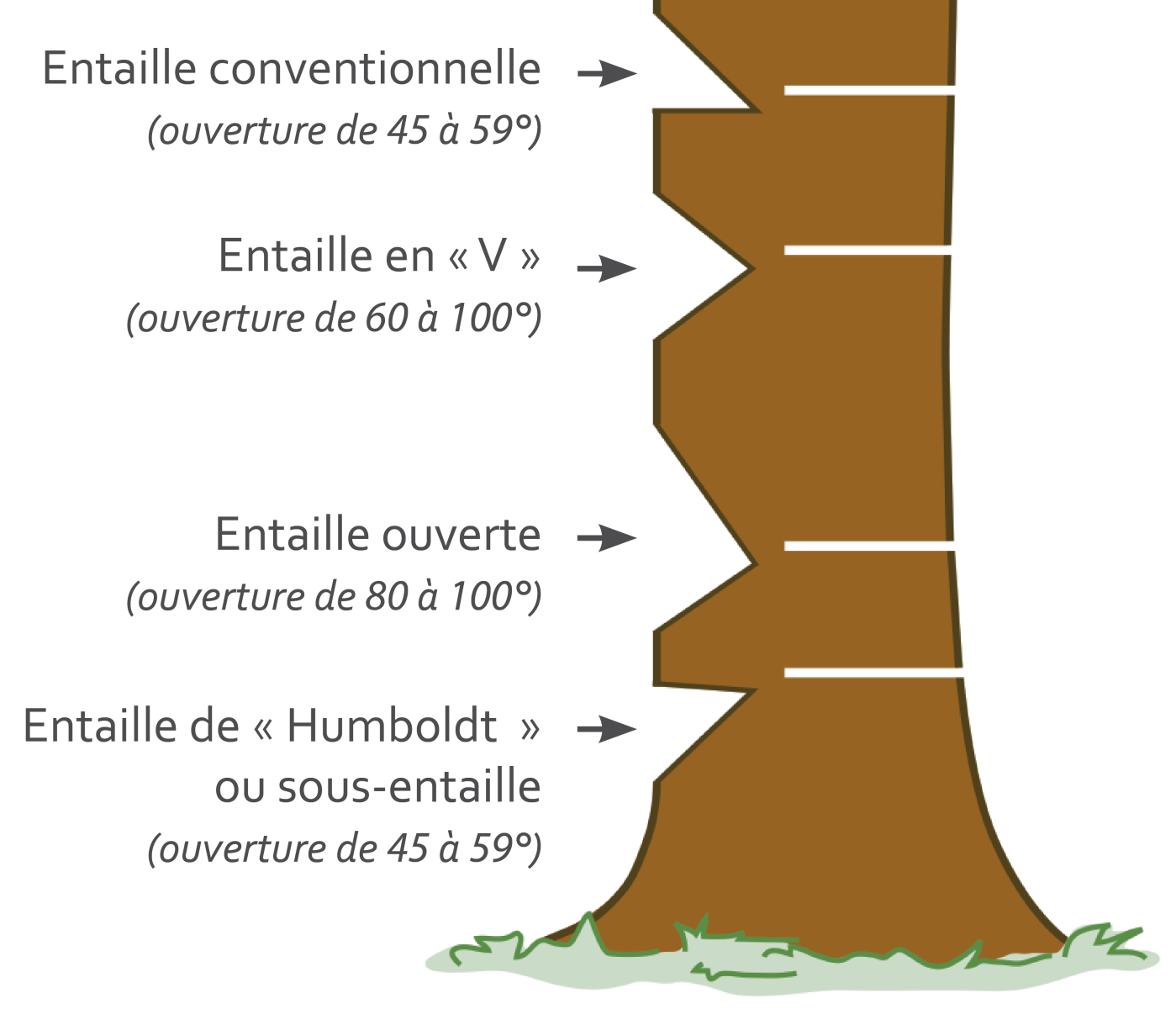 Il existe plusieurs types d’entailles. L’entaille conventionnelle est la plus couramment utilisée. Les entailles en « V » ou ouvertes s’utilisent en hiver, sur des sols en pente et avec des arbres creux. L’entaille de « Humboldt » maximise la longueur des billes dont le bois a une grande valeur.