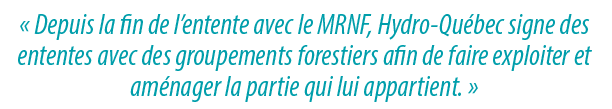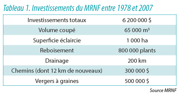 Les plantations et la forêt naturelle ont néanmoins besoin d’entretien. En 1978, Hydro-Québec et le ministère de l’Énergie et des Ressources (MER) conviennent d’une entente qui permet d’assurer la gestion et l’aménagement de la forêt. Quelques années plus tard, une première étude d’aménagement, dite préliminaire, propose des travaux sylvicoles à réaliser : des éclaircies commerciales dans les plantations, des travaux de drainage, la construction de chemins et la plantation de feuillus nobles. La récolte de bois s’intensifie. Hydro-Québec procède alors à de nombreux investissements, notamment pour la construction de chemins.