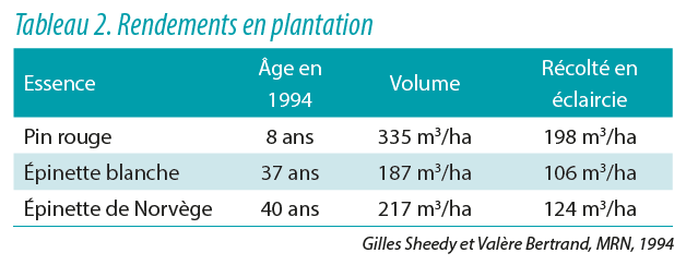 Dans l’un des rapports, on peut lire que l’épinette blanche traitée en 1989 présente un accroissement annuel moyen de 5,2 m3 par hectare pour des arbres âgés de 23 ans. Le tableau 2 montre que le pin rouge et l’épinette de Norvège performent très bien, selon ces études.