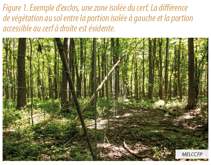 Le cerf de Virginie est le cervidé le plus répandu en Amérique du Nord. Au Québec, la survie de l’animal est fortement influencée par les hivers rigoureux, qui se font de plus en plus rares dans le sud de la province. Ce phénomène a entraîné une forte montée des populations de cerfs notamment en Estrie dans les dernières années, qui engendre à son tour des conséquences, telles que la déprédation en milieu agricole, le manque de régénération forestière et les accidents routiers. Les producteurs agricoles mentionnent ces difficultés depuis plusieurs années et la photo ci-contre d’un « exclos », une zone isolée du cerf à l’aide d’une clôture, démontre bien la pression de ce cervidé sur nos forêts.