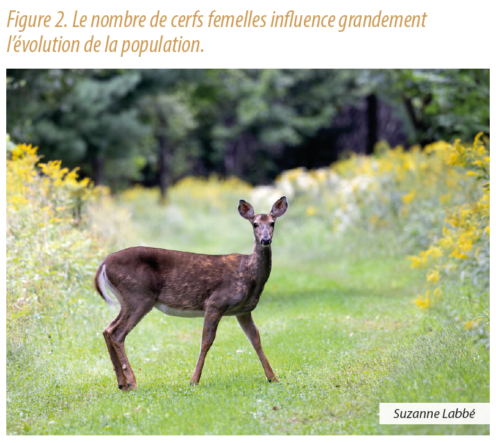 Avant de présenter les outils développés dans le cadre de ce projet, il est important d’être informé sur certains principes afin d’optimiser les activités de chasse et ainsi, voir de véritables résultats. D’abord, puisque les cerfs mâles sont polygames et qu’une femelle donne naissance en moyenne à deux faons par an pendant toute sa vie, le nombre de femelles est le facteur qui influence le plus l’évolution d’une population de cerfs. Lorsque les conditions favorisent la survie des petits, la population peut croître très rapidement. Récolter des femelles durant la saison de chasse est donc le moyen le plus efficace d’avoir un impact sur le nombre total d’animaux au fil des ans.